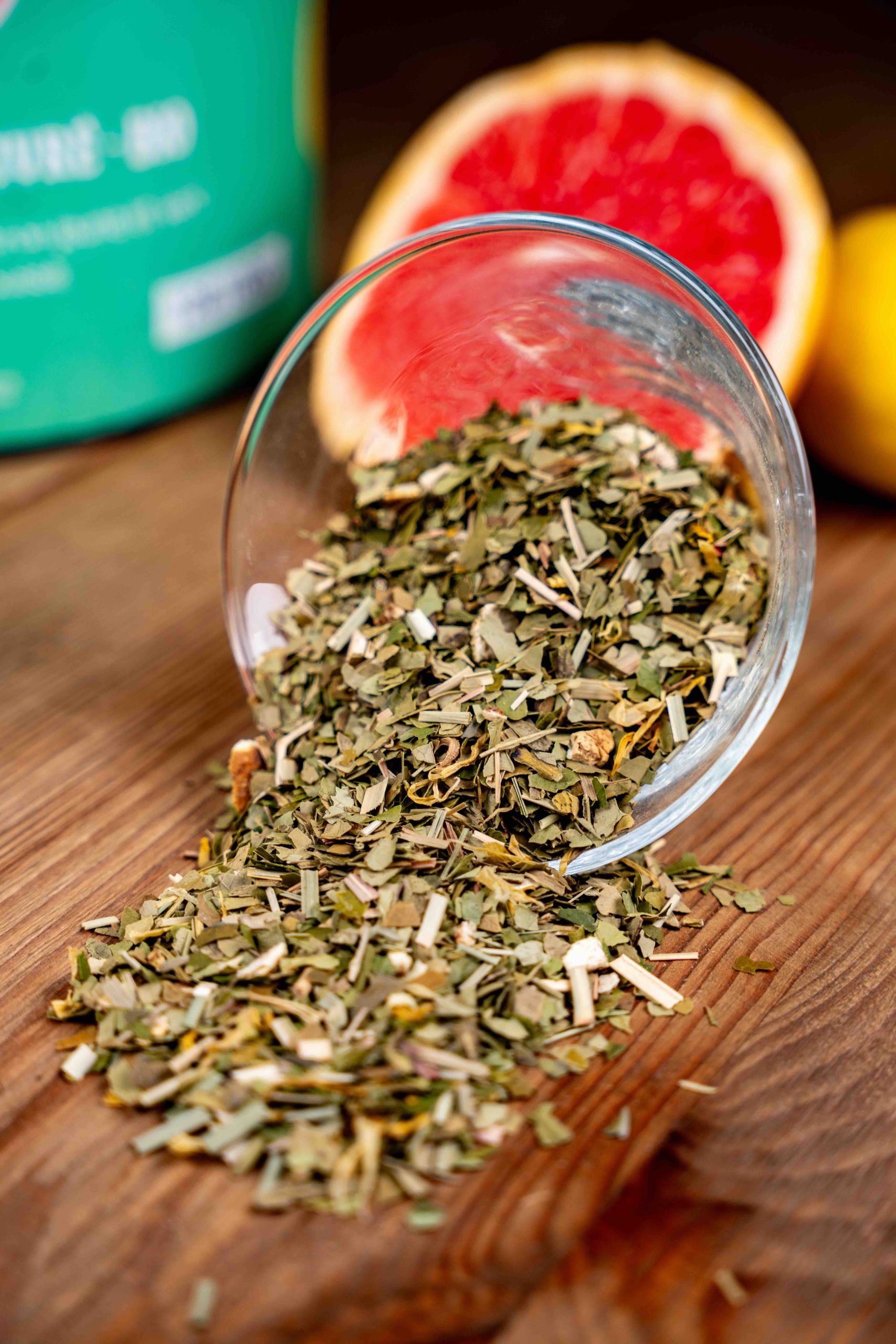 Ingrédients : Maté vert*, écorces de citron*, morceaux de pamplemousse*, citronnelle*, arômes naturels